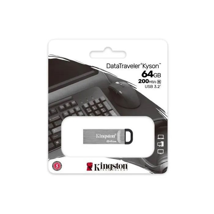 Kingston DataTraveler Kyson 3.2 este o unitate flash USB tip A de culoare argintie, ce ofera un spatiu de 64 GB ideal pentru stocarea de muzica, imagini, filme sau documente. Carcasa unitatii USB Kingston Kyson este realizata fara imbinari, din metal, fiind rezistenta la zgarieturi si mur-darie. Datorita designului fara capac si formei compacte, aceasta unitatea flash poate fi atasata cu usurinta la breloc, geanta sau chiar purtata la gat. Kingston Kyson este compatibil cu porturile USB 3.2. Viteza de citire: 200 MB/sec. Dimensiuni: 39×12.6×4.9 mm.