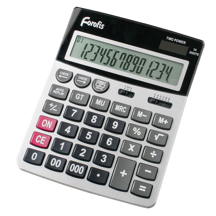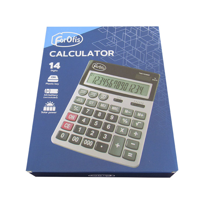 Calculator de birou cu display LCD ce afiseaza 14 digiti, cu insertii din metal. Calculatorul este dotat cu functie de Reluare automata. Acest calculator dispune de o alimentare duala: baterie A4 si celula solara. In conditii de iluminare normala, calculatorul este alimentat de celula solara. Daca iluminarea scade sub un anumit nivel, alimentarea va fi asigurata de baterie. Calculatorul este prevazut cu taste din plastic si cu picioare de cauciuc contra alunecarii. Dimensiunile calculatorului sunt urmatoarele: 186x152x27 mm.