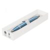 Pix Parker IM Royal Rituals albastru cu accesorii cromate, un pix ce face parte din gama IM Royal Rituals. Intr-o lume care curge in fluxuri rapide si gesturi scurte, colectia Parker IM Royal Rituals propune un act rar: sa incetinesti. Sa-ti asculti gandurile. Sa le transformi in cuvinte, nu in graba, ci in tihna. Aici, scrisul nu mai este doar mijloc de comunicare. Devine ritual. Aceasta colectie nu este despre obiecte luxoase, ci despre stari. Despre cum un instrument de scris bine ales iti poate ancora mintea, clarifica intentiile si da greutate gandurilor. Corpul pixului este realizat din alama, lacuit cu lac albastru mat. Pixul este prevazut cu un mecanism ce se actioneaza prin click (apasare) si contine o rezerva Parker. Pixul este dotat cu un grip din alama lacuit cu lac albastru mat. Ac-cesoriile pixului sunt realizate din alama, placate cu crom. Pixul este dotat cu un clips realizat din otel inoxidabil, placat cu crom. Pixul se livreaza ambalat in cutie de cadou, si reprezinta un cadou ideal pentru orice ocazie. Se poate opta si pentru o ambalare premium, intr-un extrem de elegant etui de piele sau o cutie de cadou, pe care le puteti alege din Accesorii pentru cadouri.