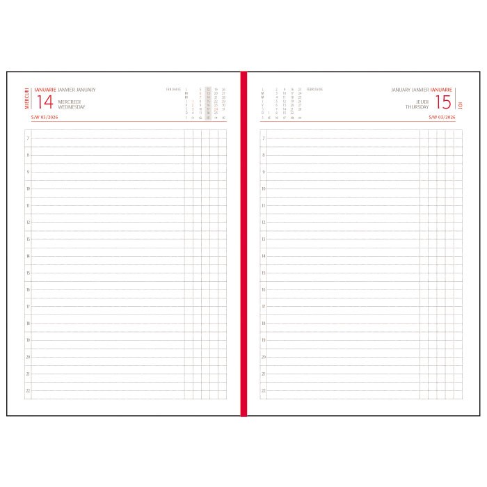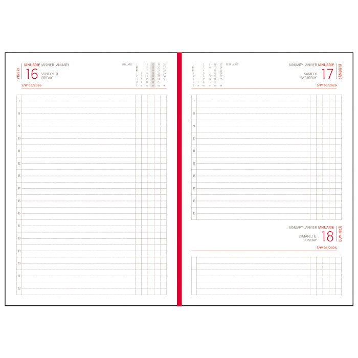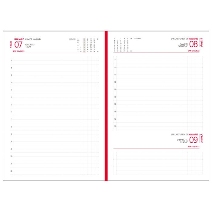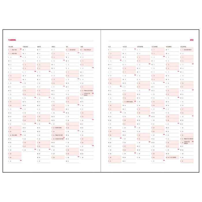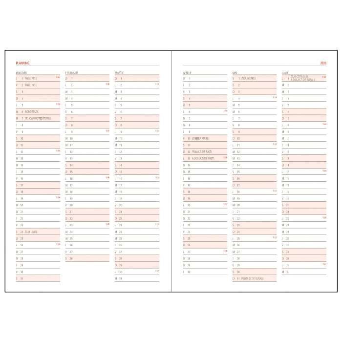 Agenda datata pentru anul 2026, disponibila in format A5, partenerul ideal pentru organizarea zilnica, in activitatile profesionale sau personale. Cu un design clasic si elegant, aceasta agenda este perfecta pentru a-ti pastra notitele, planurile si ideile intr-un mod ordonat si stilat. Agenda contine un numar de 352 pagini, asigurand astfel suficient spatiu pentru toate notitele tale im-portante. Agenda este realizata din hartie offset alba, cu un gramaj de 70g/mp, ceea ce asigura o senzatie placuta la scris si asigura o experienta de inalta calitate. Paginile agendei sunt imprimate in doua culori: rosu si gri. Agenda este structurata de urmatoarea maniera: pe prima pagina are ru-brica pentru datele personale, calendarele pentru anii 2026 si 2027 si 4 pagini ce contin anul 2026 sub forma tabelara. Pe ultimele pagini agenda contine 24 pagini pe care se pot nota diverse in-formatii si 7 pagini cu harti color, perfecte pentru calatori sau pentru cei care doresc sa aiba mereu o referinta geografica la indemana. Agenda este prevazuta cu un semn de carte integrat de culoare rosie, care te va ajuta sa gasesti rapid pagina dorita. Coperta agendei este buretata, realizata din material de foarte buna calitate, tip imitatie piele, ceea ce o face placuta la atingere, si ii ofera o protectie suplimentara. Finisarea cusuta si legata confera o rezistenta sporita. Agenda are coperta de culoare rosu texturat. Coperta agendei permite persoanalizare tip folio sau timbru sec. Dimensi-unile agendei sunt urmatoarele: 14×20.5 cm (format finit), fiind usor de transportat si de folosit in orice situatie. Alege agenda A5 Basic Ego pentru a-ti organiza zilele intr-un mod eficient si stilat, beneficiind de o calitate premium si un design sofisticat.