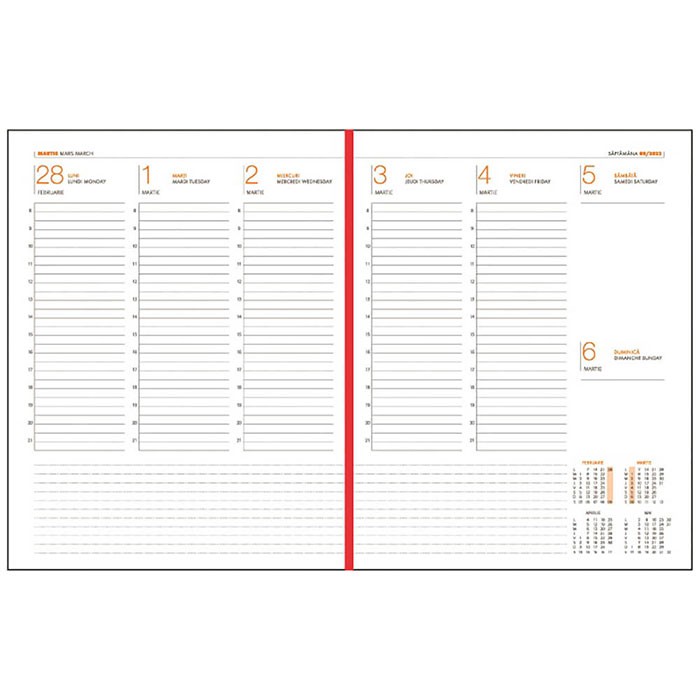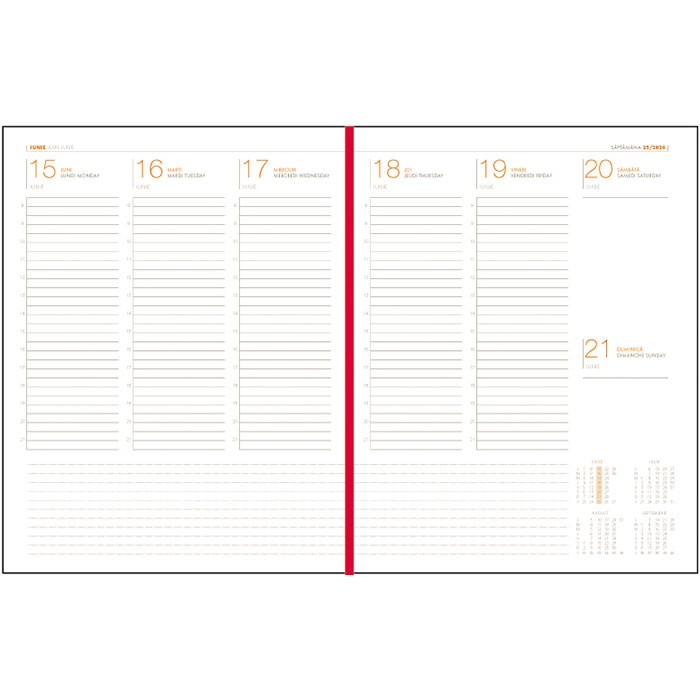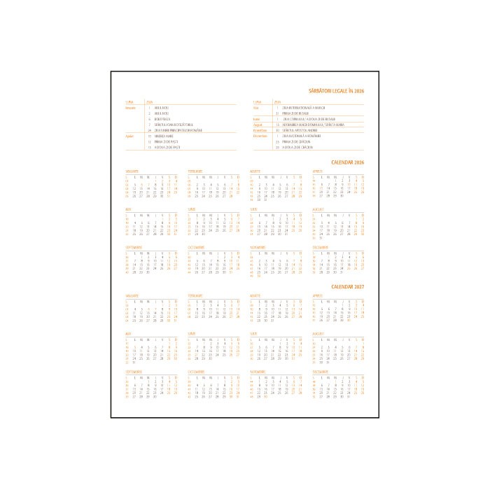 Agenda Lux Ego pentru anul 2026, in format A4, datata saptamanal, o agenda eleganta si function-ala, alegerea ideala pentru cei care apreciaza organizarea si calitatea superioara. Cu pagini datate, agenda te ajuta sa iti planifici cu usurinta activitatile zilnice, saptamanale si lunare, devenind astfel ideala pentru notite, planificarea intalnirilor sau activitatilor. Agenda contine un numar de 144 pagini, fiind realizata din hartie de culoare alba, cu un gramaj de 70g/mp, pentru o experienta de scris placuta si eleganta. Paginile agendei sunt imprimate in doua culori: portocaliu si gri. Agenda este structurata de urmatoarea maniera: pe prima pagina contine rubrica pentru datele personale, urmata de calendarul pentru anii 2026 si 2027 si 2 pagini ce contin anul 2026 sub forma tabelara. Pe ultimele pagini agenda contine 32 pagini pe care se pot nota diverse informatii si 7 pagini cu harti color, perfecte pentru calatori sau pentru cei care doresc sa aiba mereu o referinta geografica la indemana. Agenda este prevazuta cu un semn de carte de culoare rosie, pentru a te ajuta sa gas-esti rapid pagina dorita. Colturile agendei sunt perforate, astfel ca ai posibilitatea de a rupe coltul odata ce pagina e completata, pentru ca la urmatoarea utilizare a agendei sa stii exact unde ai ramas. Copertile agendei au culoarea albastru petrol texturat, sunt buretate si realizate din material de foarte buna calitate, tip imitatie piele. Coperta agendei permite persoanalizare tip folio sau tim-bru sec. Agenda este lipita si cusuta pe lateral. Finisata cu atentie prin cusatura si legare, agenda beneficiaza de o rezistenta sporita si o durabilitate remarcabila. Cu un format finit de 21×27 cm, aceasta agenda este perfecta pentru notite detaliate si planuri bine structurate. Agenda A4 Lux Ego este mai mult decat un simplu instrument de organizare; este un partener de incredere pentru ori-cine doreste sa ramana organizat si stilat in acelasi timp.