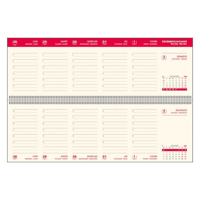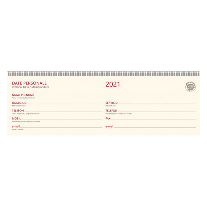 Planner datat pentru anul 2021, ce contine un numar de 112 pagini, realizate din hartie offset de culoare ivorie, cu un gramaj de 70 g/mp. Paginile plannerului sunt imprimate in doua culori: rosu si gri. Copertile planner-ului sunt cartonate, realizate din material tip imitatie de piele, de culoare maro. Plannerul este prins cu spira metalica colorata asortata cu coperta. Plannerul se preteaza pentru personalizare. Dimensiunile plannerului sunt urmatoarele: 30 x 10 cm (format finit).