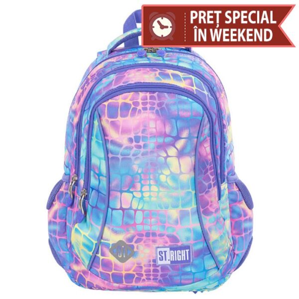 Ghiozdan pentru clasele I-IV, 3 compartimente, Majewski, Gama St. Right, Colectia Pastel Snake, un ghiozdan modern si confortabil, de foarte buna calitate, finisat si decorat cu tehnologii avansate. Ghiozdanul este confectionat din materiale impermeabile, rezistente la uzura si inghet. Ghiozdanul este deosebit de incapator, cu o compartimentare excelenta, avand spatii pentru carti, caiete, accesorii si rechizite, asigurand astfel o foarte buna organizare. Prevazut cu un compartiment principal ce se inchide cu doua fermoare si doua compartimente frontale ce se inchid cu fermoar, ghiozdanul este deosebit de spatios si practic. Compartimentul principal al ghiozdanului este dotat cu un buzunar special pentru a pastra diverse articole de mici dimensiuni. Unul din compartimentele frontale ale ghiozdanului este dotat cu mai multe separatoare interioare (destinate articolelor precum chei, bani, memory-stick-uri, accesorii telefon, instrumente de scris sau alte obiecte importante de mici dimensiuni), precum si cu un breloc detasabil pentru cheie. Ghiozdanul este prevazut cu doua buzunare laterale cu elastic, ideale pentru a pastra recipientul cu apa. Ghiozdanul este dotat cu elemente reflectorizante pe partea din fata, pe bretele si pe laterale. Ghiozdanul este prevazut cu un maner buretat pentru a putea fi purtat si in mana. Spatele si bretelele sunt intarite si buretate cu un burete gros, oferindu-le fermitate si avand rolul de a proteja umerii si spatele. Spatele ghiozdanului este buretat ergonomic, dotat cu o zona de contact cu plasa, pentru o buna circulatie a aerului. Bretelele ghiozdanului sunt ajustabile, pentru ca acesta sa poata fi aranjat perfect pe spate. Fermoarele au zona de prindere cauciucata si profilata, pentru prindere usoara. Cheitele fermoarului compartimentului principal permit utilizarea unui lacat sau a unei criptari TSA. Baza ghiozdanului are zone de contact cauciucate pentru protejare la umezeala. Dimensiunile ghiozdanului sunt urmatoarele: 40x26x13 cm.