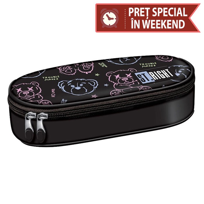 Penar borseta 1 compartiment, 1 extensie, oval, Majewski, Colectia Bear, un penar compact, dar spatios in acelasi timp. Penarul este realizat dintr-un material textil, rezistent si impermeabil. Penarul are o forma ovala ergonomica si este prevazut cu doua fermoare rezistente. Penarul dispune de o capacitate mare de echipare, oferind suficient spatiu pentru diverse rechizite: rigla, ascutitoare, compas, instrumente de scris sau instrumente de colorat. Penarul este dotat cu o extensie, care este prevazuta cu elastice pentru fixarea instrumentelor de scris, precum si cu un buzunar interior ce se inchide cu fermoar. Dimensiunile penarului sunt urmatoarele: 20.5×9.5×5 cm.