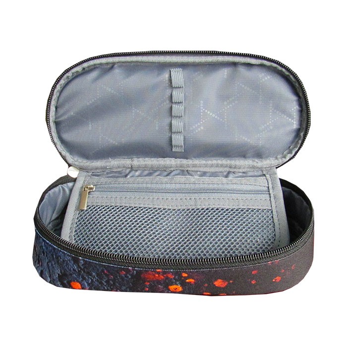 Penar borseta 1 compartiment, 1 extensie, oval, Majewski, Colectia Red Planet, un penar compact, dar spatios in acelasi timp. Penarul este realizat dintr-un material textil, rezistent si impermeabil. Penarul are o forma ovala ergonomica si este prevazut cu doua fermoare rezistente. Penarul dispune de o capacitate mare de echipare, oferind suficient spatiu pentru diverse rechizite: rigla, ascutitoare, compas, instrumente de scris sau instrumente de colorat. Penarul este dotat cu o extensie, care este prevazuta cu elastice pentru fixarea instrumentelor de scris, precum si cu un buzunar interior ce se inchide cu fermoar. Dimensiunile penarului sunt urmatoarele: 20.5×9.5×5 cm.