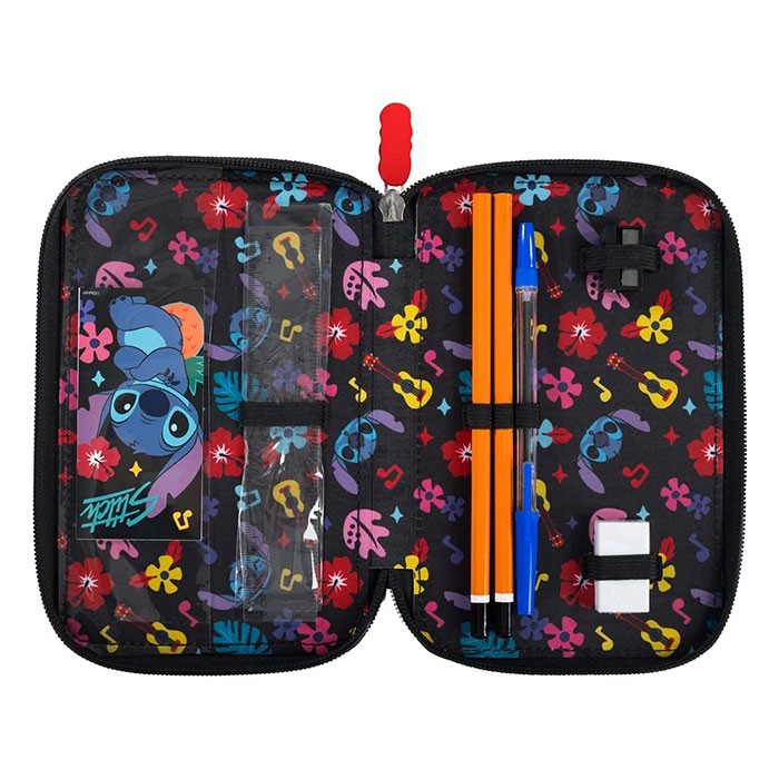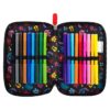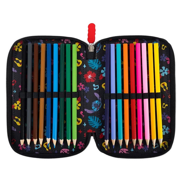 Penar echipat, prevazut cu 3 fermoare, Majewski, Gama St. Right, Colectia Stitch Black, un penar compact si spatios. Penarul este realizat dintr-un material textil, de foarte buna calitate, rezistent si impermeabil. Penarul este prevazut cu trei compartimente si dispune de o capacitate mare de echipare, oferind suficient spatiu pentru diverse rechizite. Penarul este echipat cu urmatoarele re-chizite: 1 rigla de 15 cm, 1 radiera, 1 ascutitoare, 9 carioci, 9 linere, 18 creioane colorate, 2 creioane grafit, 2 pixuri, 1 compas, 1 echer, 1 raportor si 1 orar. Fermoarele penarului sunt rezistente, dotate cu o zona de prindere cauciucata si profilata, pentru prindere usoara. Dimensiunile penarului sunt urmatoarele: 20x13x6 cm.