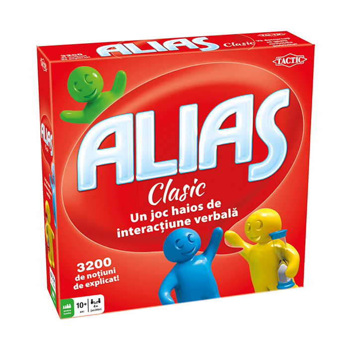 Joc de societate – Alias Clasic, un joc de societate si creativitate, ce dezvolta atentia, perspicacitatea, memoria, spiritul de echipa, abilitatile de colaborare si asociere, inteligenta si nu in ultimul rand, vocabularul, toate intr-un mod distractiv. Alias Clasic este versiunea originala a acestui joc amuzant si alert. Jocul contine: o tabla de joc, 400 de cartonase cu 3200 cuvinte, 1 clepsidra, 6 pioni si regulamentul de joc. Alias Clasic este un joc creativ de comunicare: jucatorii incearca sa explice cuvinte de pe cartonas coechipierilor, fara a rosti cuvantul propriu-zis. Scopul jocului este ca jucatorii sa-si ajute echipa sa treaca prima linia de sosire. Fiecare notiune ghicita inseamna un pas inainte. Jucatorii isi pot pune in evidenta personalitatea, capacitatile artistice, fantezia si indemanarea. Indiferent ca te joci cu prietenii, sau intr-o zi ploioasa cu familia, pe parcursul jocului, toata lumea va rade cu lacrimi. Numar minim de jucatori: 4. Jocul este contraindicat copiilor mai mici de 3 ani. Se recomanda utilizarea produsului de catre copiii mai mari de 10 ani. Produsul poate fi curatat cu o carpa moale, uscata. Se recomanda ferirea produsului de umezeala si caldura excesiva. Produsul este fabricat in Finlanda.
