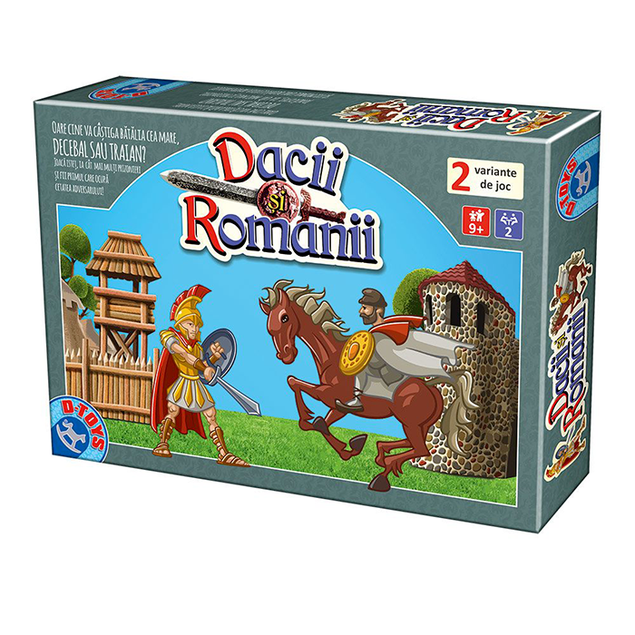 Joc de societate – Dacii si romanii, un joc de strategie ce dezvolta gandirea strategica si spiritul competitiv, reproiectat in baza vechiului joc Dacii si Romanii, creat de Mircea Ivanciu. Jocurile de societate ajuta la dezvoltarea inteligentei, memoriei, imaginatiei si a gandirii logice, oferind o distractie nemaipomenita pentru toata familia. Jocul contine: o tabla de joc cu 2 accesorii care reprezinta cetatea dacica, respectiv tabara romana, 12 pioni, 12 suporturi pentru pioni si regulamentul de joc. Numar de jucatori: 2. Scopul jocului este de a captura cat mai multi soldati inamici si de a ocupa cetatea adversarului. Jocul este contraindicat copiilor mai mici de 3 ani. Se recomanda utilizarea produsului de catre copiii mai mari de 9 ani. Produsul poate fi curatat cu o carpa moale, uscata. Se recomanda ferirea produsului de umezeala si caldura excesiva. Produsul este fabricat in Romania in conformitate cu reglementarile EN71.