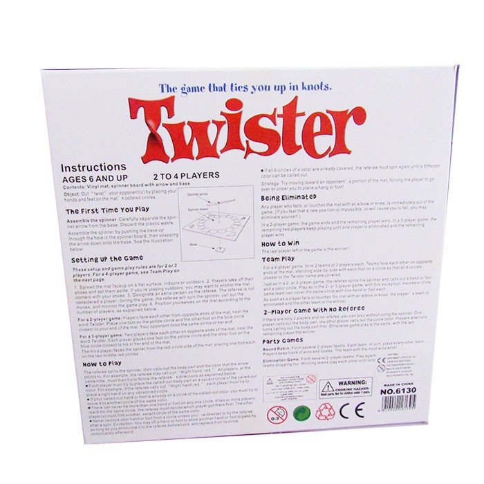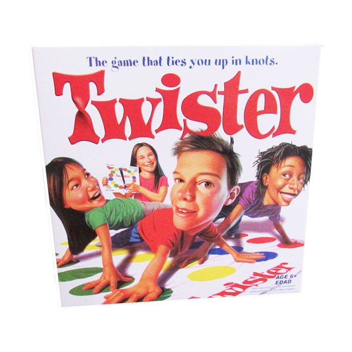 Joc de societate – Twister, un joc distractiv, de indemanare, ce te innoada, la propriu. Rasuceste-te si incurca-te. Jocurile de societate ajuta la dezvoltarea inteligentei si a gandirii logice, oferind o distractie nemaipomenita pentru toata familia. Jocul contine o ruleta, un covoras si instructiunile de joc. Numar de jucatori: 2+. Cu cat sunt mai multi participanti, cu atat jocul devine mai distractiv. Jocul este alcatuit dintr-o panza de plastic care sta intinsa pe podea si care contine 24 de cercuri dispuse liniar: 6 de culoare rosie, 6 de culoare galbena, 6 de culoare albastra si 6 de culoare verde. Jocul include si o bucata de carton patrata, impartita in 4 sectiuni (rosu, galben, albastru si verde) care reprezinta pe rand: piciorul stang, piciorul drept, mana stanga, mana dreapta. De acest carton este atasat un ac de plastic care indica mutarile si care va fi invartit pentru fiecare miscare de catre un arbitru. Fiecarei sectiuni din cadran ii corespunde urmatoarea miscare pe care jucatorii trebuie sa o faca. Jocul continua astfel, pana cand un singur jucator va ramane in picioare, acela fiind deci si castigatorul. Jucatorii nu au voie sa atinga solul cu genunchii, cu coatele sau cu fundul. Acest lucru face jocul mult mai dificil. Uneori este nevoie ca un jucator sa mearga prin jurul piciorului altui jucator pentru a atinge o anume culoare. Jocul este contraindicat copiilor mai mici de 3 ani. Se recomanda utilizarea produsului de catre copiii mai mari de 6 ani. Produsul poate fi curatat cu o carpa moale, uscata. Se recomanda ferirea produsului de umezeala si caldura excesiva.