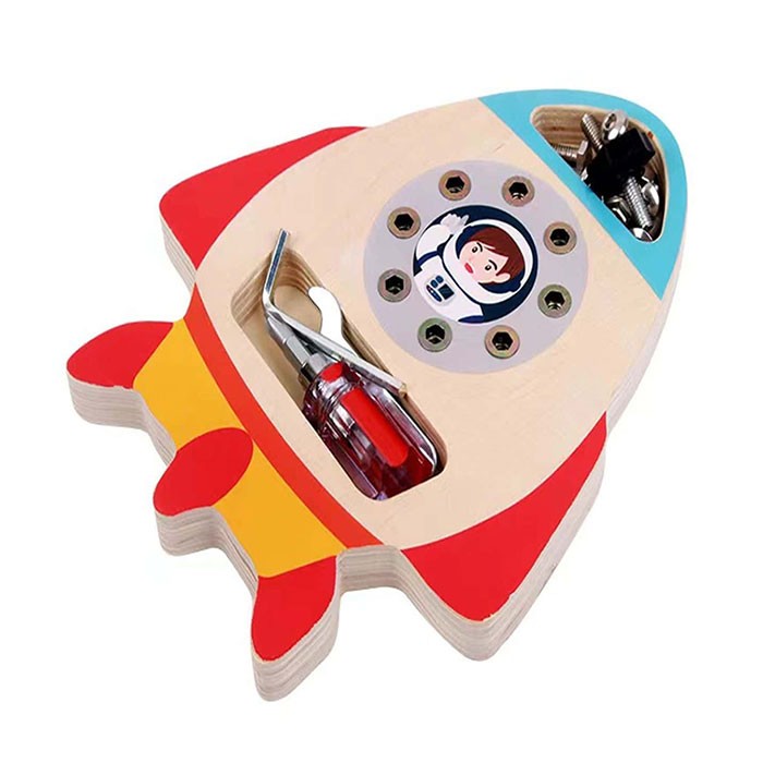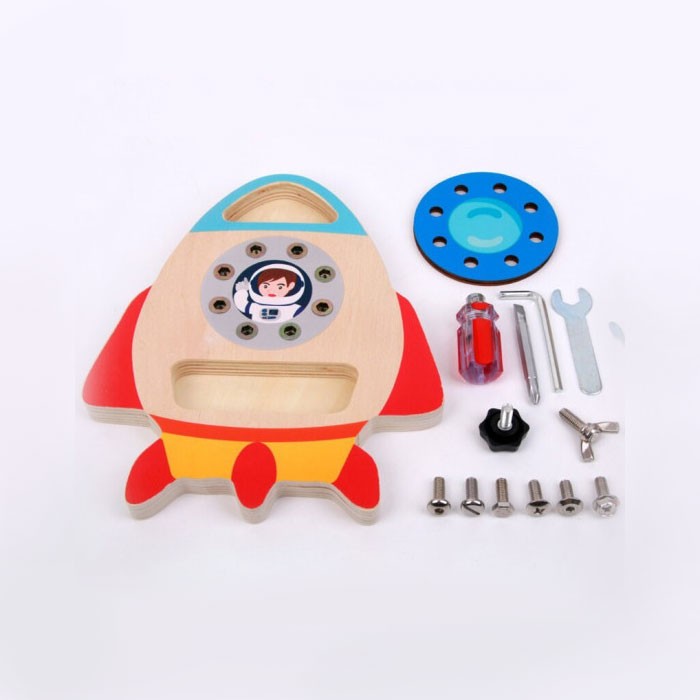 Jucarie educativa realizata din lemn, tip Montessori, potrivita pentru invatarea notiunilor de coordonare si asociere. Jucariile din lemn au fost intotdeauna interesante si sigure pentru copii, acestea contribuind major la dezvoltarea deprinderilor motorii si perceptiei senzoriale ale copiilor. Cu ajutorul jucariilor din lemn, copilul isi dezvolta motricitatea fina, coordonarea ochi-mana, orientarea in spatiu, competenta de a recunoaste culori si forme diferite, atentia si imaginatia, toate acestea intr-un mod distractiv si in deplina siguranta. Cutia contine o racheta, impreuna cu diverse piulite, chei, surubelnita si imbus. Dimensiunile cutiei sunt urmatoarele: 24×19 cm. Produsul nu este recomandat copiilor mai mici de 3 ani. Se recomanda utilizarea produsului de catre copiii mai mari de 3 ani. Produsul poate fi curatat cu o carpa moale, uscata.