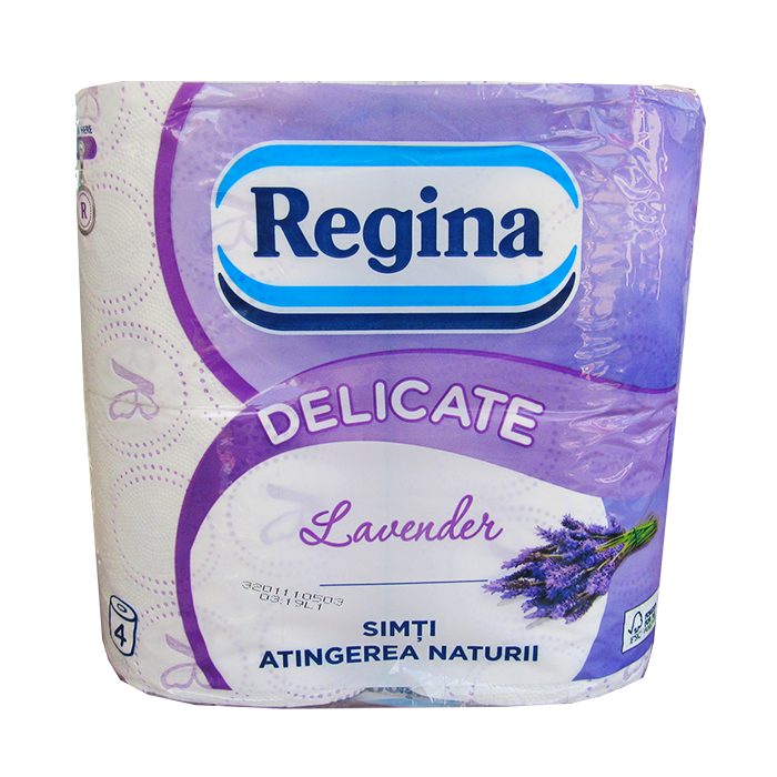 Hartie igienica Regina Delicate, o hartie de o calitate deosebita, catifelata si rezistenta. Hartia Regina Delicate este acum mai delicata si astfel ideala pentru pielea cea mai sensibila, cum ar fi cea a unui copil, conform testelor clinice. Hartia este disponibila in varianta parfumata, cu aroma de lavanda. Hartia Regina Delicate este dispusa in 3 straturi si portionata cate 135 foi/rola. Dimensiune foaie: 12 x 9.5 cm. Lungime rola: 16.2 m. Greutate rola: 80 g. Hartia igienica Regina Delicate este realizata din celuloza pura si este ambalata cate 4 role/set. Unitate de vanzare: set.